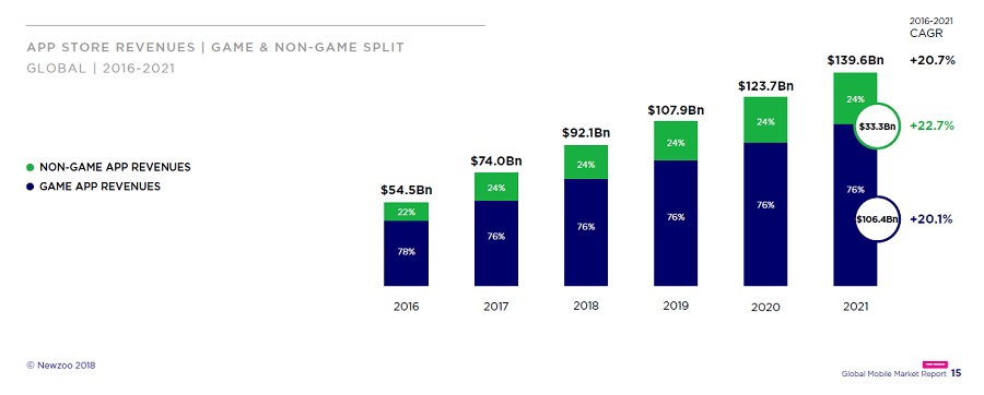 近日,据市场研究机构Newzoo最新发布报告显示,2018年全球移动市场产值将达到921亿美元,其中,全球移动游戏收入将达到近700亿美元。预计到2021年,全球移动游戏收入将突破千亿美元,大约为1064亿美元。Newzoo表示,预计今后3年全球移动游戏市场的收入增长将主要将依赖于亚太地区,中国无疑是其主要市场。预计截至到2018年底,中国游戏市场收入将达到379亿美元。